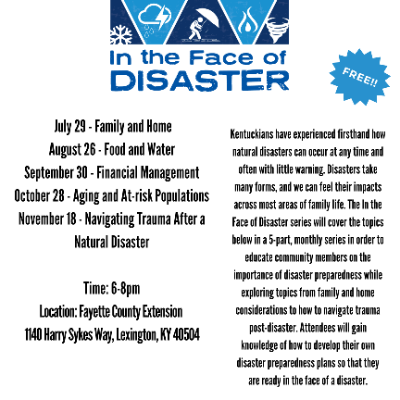 Kentuckians have experienced firsthand how natural disasters can occur at any time and often with little warning. Disasters take many forms, and we can feel their impacts across most areas of family life. The In the Face of Disaster series will cover the topics below in a 5-part, monthly series in order to educate community members on the importance of disaster preparedness while exploring topics from family and home considerations to how to navigate trauma post-disaster. Attendees will gain knowledge of how to develop their own disaster preparedness plans so that they are ready in the face of a disaster.